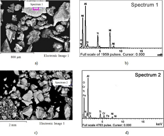 Частицы средних размеров 30–50 мкм содержат: Al (39,8), Ti (7,3), Cr (14,8), Ni (22,1), Zr (5,0) и оплавленный Fe (2,7). Мелкие ПЭ, менее 30 мкм: Al (27,2), Ti (6,8), Cr (6,0), Ni (6,8), Zr (5,9) и оплавленный Fe (1,4), в том числе ПЭ парогазовой фазы (менее 10–4 мм). С уменьшением размеров ПЭ в их составе незначительно меняется вес матричного элемента Al, почти на порядок уменьшается вес связки Ni и возрастает вес тугоплавких добавок Ti, Cr и Zr.