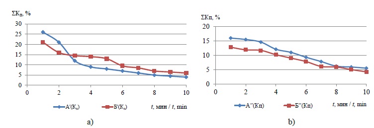 Коэффициент электромассопереноса во всех случаях имел наибольшие величины значений в первые 1–3 мин ЭИЛ, достигая ΣКп = 22–27 % при ЭИЛ анодными материалами с режимами Аʹ, Бʹ, и наименьшие ΣКп = 4,8–5,1 % при Аʹʹ, Бʹʹ и t = 10 мин (рис. 4). В связи с формированием «вторичных структур» на поверхностях электродов значения величин ΣКп постепенно уменьшались из-за длительности процесса ЭИЛ и образования «вторичного» массопереноса.