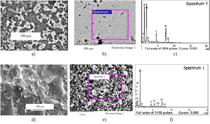 Химический анализ в различных местах забора проб показал, что анодный материал А неоднороден, анализируемые по цвету фазы (светлая, серая, темная) состоят из следующих элементов (вес, %): Al (8,8–29,6), Ti (2,4–15,0), Ni (13,3–68,0), Zr (2,3–8,6); Б: Al (11,9–36,2), Ti (1,0–16,5), Ni (24–57,1), Zr (2,4–14,4), Cr (3,8–21,4).