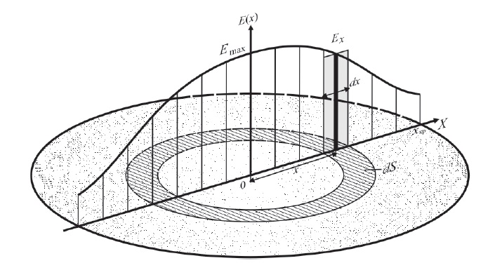 Характерными точками здесь следует выделить максимальное значение освещенности Еmax; минимальное значение освещенности Еmin в точке поверхности с координатой xкр; среднее значение освещенности Еср, которое может быть найдено из нижеследующих вычислений.