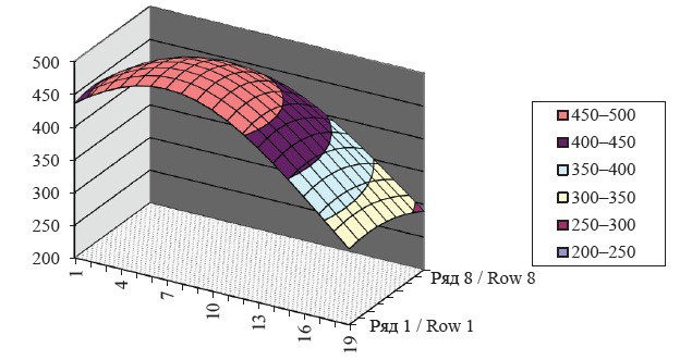 На рисунке 4 совмещенно показаны формируемое распределение освещенности и горшочки с растениями перца, размещенные на освещаемой поверхности. В качестве светильника взят светодиодный излучатель мощностью 100 Вт. Излучаемый им световой поток составлял ФИС = 9 027 лм.