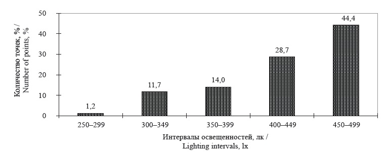 На рисунке 8 показан частотный график распределения величины освещенности всех точек рабочей поверхности. Он отображает количество точек на поверхности, освещенность в которых попадает в интервал между двумя соседними изолюксами. Так, по графику можно найти, что освещенность от 400 до 499 лк наблюдается на 28,7 + 44,4 = 73,1 % площади поверхности.
