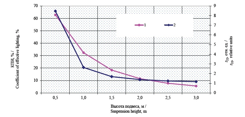 suspension height of the luminary: 1 – efficiency, %; 2 – z22, relative units