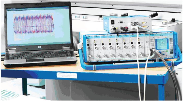 Fig. 2. Photo of equipment for amplifying and digitizing signals: laptop computer; signal amplifier