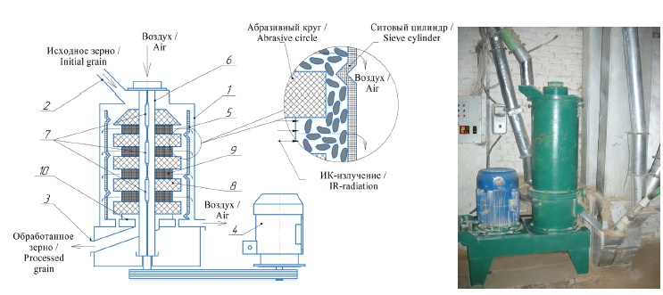 Шелушение исследуемых образцов осуществляли в производственных условиях на разработанной шелушильной машине с производительностью 0,5–1,0 т/ч. [20; 25]. Обработка протекает по принципу трения зерна о неподвижный ситовый цилиндр и подвижные абразивные круги (рис. 1). Производительность машины задается шиберной заслонкой, установленной на выходном патрубке и управляемой штурвалом через червячную передачу путем изменения площади выходного отверстия установки.