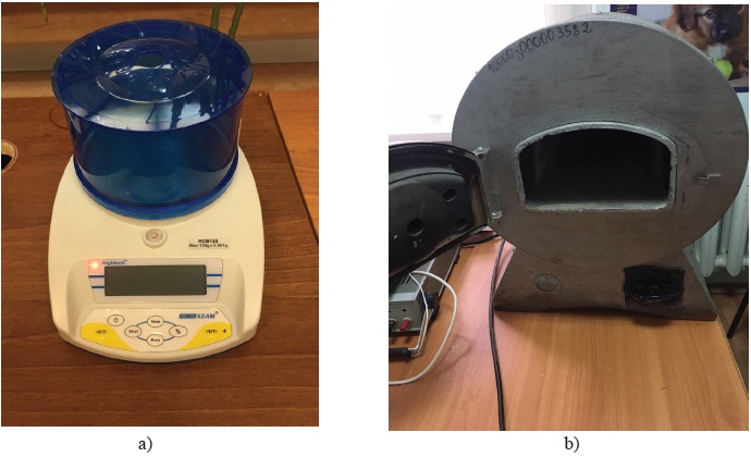 Fig. 2. Equipment for determining ash content: a) laboratory electronic scales ADAM HCB 123;