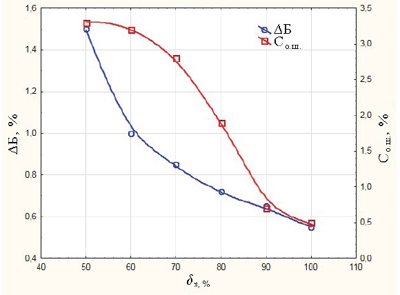 Анализ полученных зависимостей (рис. 3, 4) показывает, что с увеличением процента открытия заслонки на выходе из машины δз с 50 до 100 % происходит снижение показателей Со.ш. с 3,3 до 0,6 %, ΔЗ с 0,38 до 0,04 % и ΔБ с 1,50 до 0,55 %. Это объясняется тем, что при небольших зазорах выпускного отверстия на выходе из машины создается подпор зерна и увеличивается межзерновое давление, а процесс шелушения идет более интенсивно. При 90 % открытии заслонки сопротивление выпуску значительно уменьшается и снижается эффективность шелушения. Дальнейшее открытие заслонки позволяет зерну практически свободно выходить из машины, и шелушение осуществляется только за счет давления, создаваемого абразивными дисками при трении зерна о них и перфорированный ситовый барабан.
