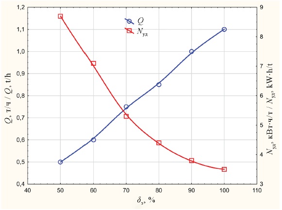 Анализ зависимости (рис. 5) показывает, что с увеличением процента открытия заслонки на выходе из машины производительность возрастает с 0,5 до 1,1 т/ч, а удельные затраты электроэнергии снижаются с 8,7 до 3,5 кВт∙ч/т. Оптимальное сочетание этих двух параметров находится в точке пересечения графиков при δз = 67 %, что соответствует Q = 0,7 т/ч, Nуд = 5,8 кВт×ч/т и согласуется с вышеприведенными данными. В этом случае комплексный критерий эффективности, с учетом энергоемкости процесса, Е2 = 4,5 кг/кВт·ч.