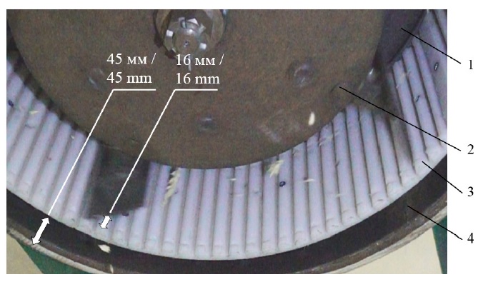 Величина зазора z = 16 мм между краем лопасти и вершиной выступа деки в данном исследовании обоснована тем, что она больше, чем толщина колосьев безостой озимой пшеницы (не более 15 мм), благодаря чему колосья не защемляются в зазоре и практически не подвергаются ударам лопастей в процессе обмолота, что снижает травмирование зерна. Для остистой озимой пшеницы и других зерновых культур может быть установлена иная величина зазора.