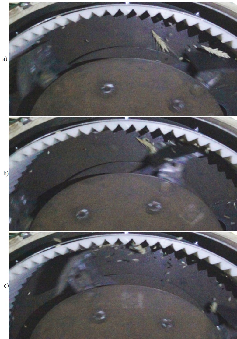 Изучение видеозаписей также показало, что в процессе обмолота не исключена возможность ударного воздействия лопастей на колосья, причем ее вероятность повышается при увеличении скорости движения лопастей.