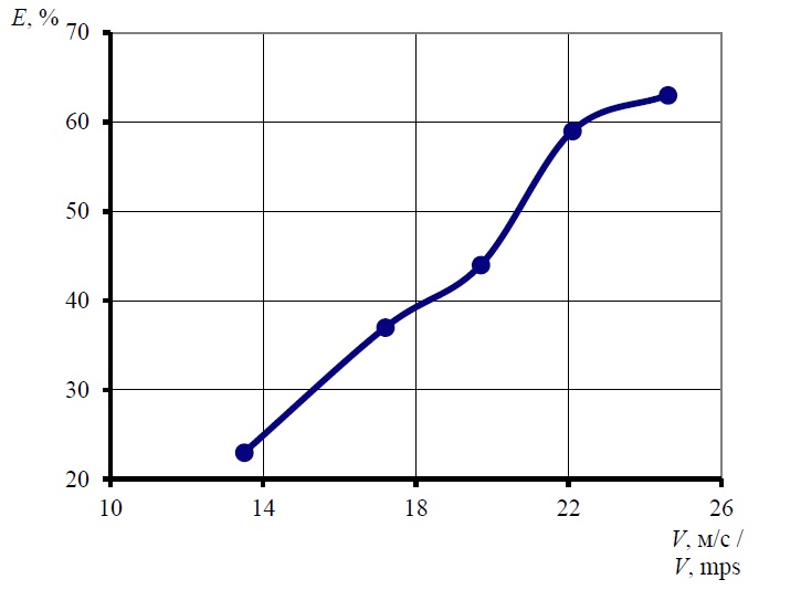 Было проведено 5 серий опытов, в каждом из которых при помощи частотного преобразователя устанавливали определенное значение частоты вращения ротора и, соответственно, линейной скорости движения лопасти. Частоту вращения ротора варьировали в диапазоне 402…732 об/мин (6,7…12,2 Гц), линейную скорость движения его лопасти соответственно изменяли в диапазоне 13,5…24,6 м/с. Каждый опыт осуществлялся в трех повторностях.