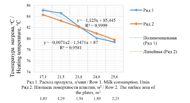 Динамика изменения более явно наблюдается в диапазоне значений от 21,5 до 24,5 л/мин, в дальнейшем динамика снижения замедляется. Требуемая температура пастеризации (82 °C) достигается при расходе молока 23,8 л/мин. Данный расход можно считать оптимальным для пастеризации молока при фиксированной площади теплообмена установки 2,23 м2 (вариант включения всех пластин секции). Указанная температура соответствует оптимальной температуре пастеризации, например, при производстве функциональных кисломолочных продуктов.
