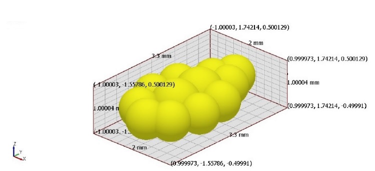 Due to the difference of agricultural materials such as grain and seeds in their form and so they have a very wide range of forms like spherical, ellipsoidal, and diamond with round or sharp-edged. Consequently, the size of the products ranges from below a millimeter to tens of centimeters. The simplified measurement of the three dimensions of the shape: length, width, and thickness, which is frequently used is not enough to accurately describe complex shapes [23]. Therefore, the complex shapes of particles are often used for DEM modelling process by clusters of rigidly joined overlapping spheres known as the multi-sphere method. The contact of multi-sphere particles is described via the contacts between their sub-spheres. Accuracy of the description of mechanical behavior is influenced by the number of particles combined into a cluster [24]. The major advantage of using spheres is the lower computation time in comparison with the real structures. As well as, the non-spherical particles demand more advanced algorithms and are more difficult to model [25]. But the main disadvantage of using spheres is that the flow patterns of the real particle shape cannot be described. Therefore, according to the physical properties of sesame seeds, a triaxial ellipsoidal particle model was established using multiple spheres. To generate an ellipsoidal structure from the spheres, several spheres must be symmetrically connected in a row. However, with an increasing number of particles, the elliptical shape increases, the mechanical time step of a discrete simulation decreases, and the computational time increases. Therefore, to replicate an ellipsoidal sesame seeds and to save computational time, several arrangements and numbers of spheres were checked in the particle flow simulations to find the optimal number of spheres for sesame seeds, which were 12 spheres. To describe the real particle behavior in our numerical model, clumps of 12 joint spheres were formed together. Its semi-axes were 3.3, 2 and 1mm as illustrated in Figure 2. The material properties and interaction properties are the most two substantial categories of material parameters for DEM modelling. Therefor the mechanical properties of the materials (Poisson’s ratio, shear modulus, and density) and particle contact parameters (Coefficient of restitution, static friction and rolling friction) used in EDEM simulations are respectively listed in Tables 2 and 3.