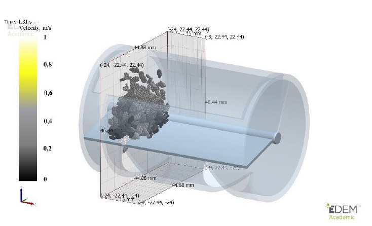 Figure 3 illustrates the component parts used in the simulation, referred to as the oscillating element, a hopper for feeding sesame seeds to the unit, and holes for output the seeds to soil surface. At the beginning of the calculation, sesame seeds were generated, after filling from the hopper, sesame seeds moving under the effect of oscillation motion by oscillating element. To study the characteristics of the outflow of sesame seeds with time during the simulation, a boundary area with 15 × 44.48 × 46.44 mm was taken in the direction of X, Y, and Z axes respectively for simulation, so that the modelling zone is surrounded by walls from all its faces except in the upper boundary. The angle of displacement magnitude for oscillating seed metering is equal to 17.5 degrees up and down. The method of coloured particles was used for continuous discharge during simulation to detect the different sesame seeds velocities as shown in Figure 3. These parameters correspond to the mode of oscillating seed metering unit operation, where its scheme was presented above.
