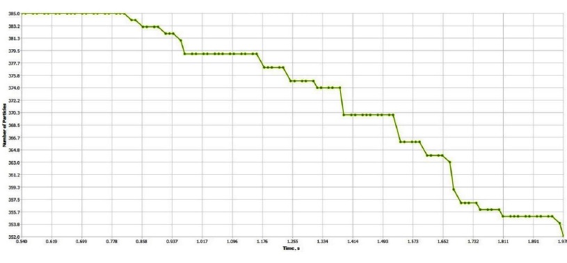 To determine the outflow rate of an equivalent spherical particle having the same volume as the sesame seeds. The sesame seeds were drop and free fall from the hopper under the influence of gravity moves freely into the oscillating seed metering after that the seeds move under oscillation motion with displacement magnitude is 17.5 degrees via an oscillating element with frequency 16 Hz during the modelling process. In addition to parameters that describe the constitutive material of the particles, the simulation time step and number of particles are necessary for the simulation setup. The simulation of the continuous sesame outflow was done using a periodic boundary condition of the geometry. Figure 4 shows the simulation results of continuous sesame seeds discharge in the oscillating seed metering model using DEM simulations. The average flow rate of sesame seeds was about 33 seeds at time 1.43 s with a time step around 0.08 s.