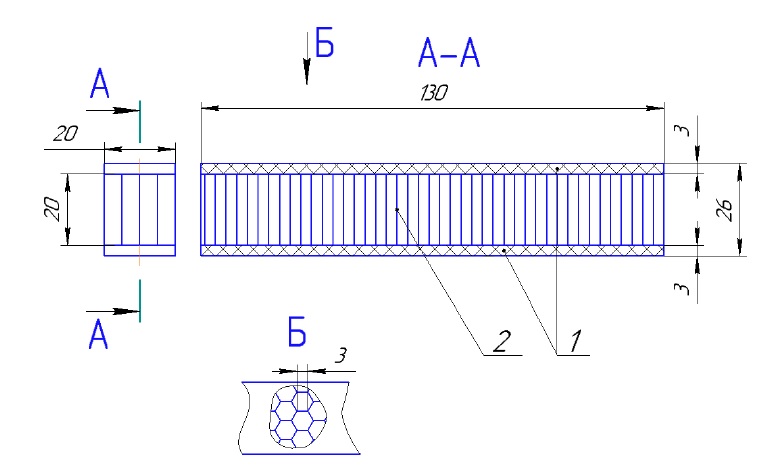 1 – пластины из ПКМ на основе стеклоткани; 2 – соты из стеклотканевого препрега (размеры в мм)