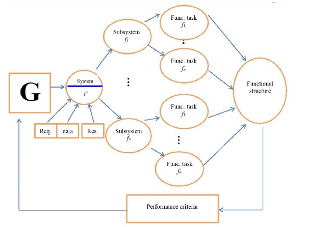 G – set of designed systems goals; F – set of realizable system function; f – functional tasks; fs – functional structure; Req. – a lot of the requirements for the system; data – a lot of data on the subject area; Res. – many resourses are used in the design of management system.