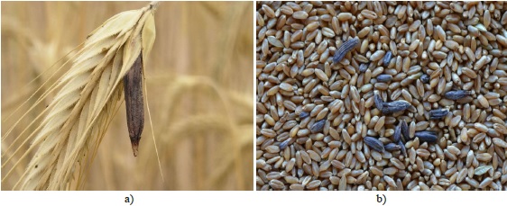 Посевы хлебных злаковых культур (рожь, пшеница овес, ячмень) и кормовых злаковых трав (пырей, костер, райграс, овсяница, тимофеевка) часто поражаются спорами спорыньи. При поражении колосьев данных злаковых культур вместо зерен образуются склероции продолговатой формы, а в зерновой массе они присутствуют в виде продолговатых рожков черно-фиолетового цвета, в ряде случаев из-за мутаций подстраиваются под цвет зерна (рис. 1) [5; 6].
