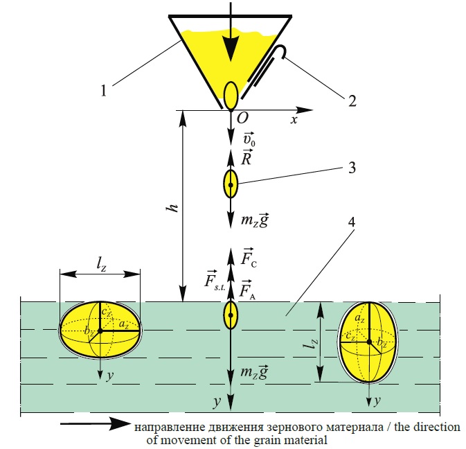 где mz – масса эллипсоидальной зерновки, кг; g – ускорение силы тяжести, g = 9,81 м/с2; υυit – скорость парусности (витания) зерновки, м/с; υz – скорость движения эллипсоидальной зерновки, м/с; h – высота расположения выходного отверстия загрузочного бункера по отношению к поверхности жидкости, м.
