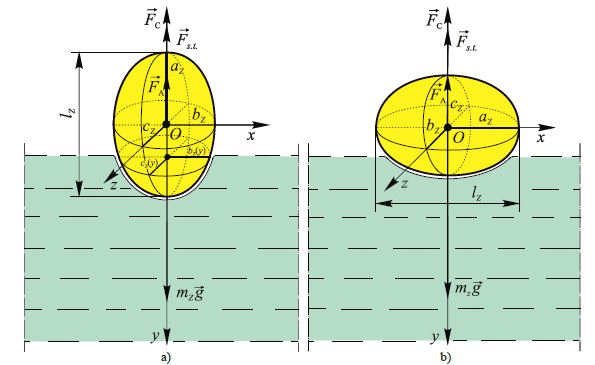 На выходе из загрузочного бункера эллипсоидальной зерновки и при движении вдоль главной большой оси 2az или вдоль главной малой оси 2сz (плашмя) ее потенциальная энергия mz gh превратится в кинетическую энергию. Данная кинетическая энергия при полном входе зерновки в жидкость и остановке полностью израсходуется на работу против силы Fs.t. поверхностного натяжения жидкости, силы Архимеда FA и силы гидродинамического сопротивления FС, появляющейся при турбулентном движении из-за разности давлений впереди эллипсоидальной зерновки и за ней17.
