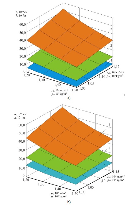 Из рисунка 7 следует, что при падении эллипсоидальной зерновки, имеющей минимальные либо максимальные или средние линейные размеры, в жидкость вдоль главной большой оси 2az либо вдоль главной малой оси 2сz (плашмя) с увеличением ее плотности ρz значения минимальной высоты расположения выходного отверстия загрузочного бункера h относительно поверхности жидкости уменьшаются, а с повышением плотности жидкости ρzh наоборот возрастают. Поведение поверхностей на рисунке 7 полностью соответствует результатам приведенного выше качественного анализа формул (18) и (22).