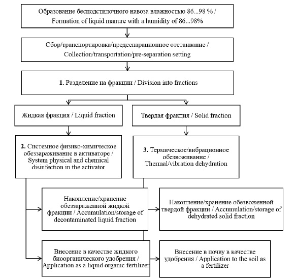 На основании анализа информационных источников на рисунке 1 представлена блок-схема экологически безопасного утилизационного цикла свиного бесподстилочного навоза, на повышение энергетической эффективности операционных воздействий которого и направлено данное исследование [1; 5; 6].