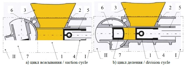 После наполнения всасывающей камеры наступает цикл деления (рис. 1b). При делении из камеры всасывания поршень нагнетает тесто в мерную камеру, заполняя ее до момента, когда мерный поршень упрется в ограничитель, настроенный на заданную массу заготовки. Затем барабан поворачивается на 90°, отрезая порцию заготовки теста, и при вертикальном положении мерной камеры мерный поршень выталкивает ее на транспортерную ленту.
