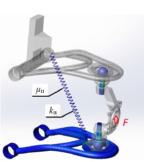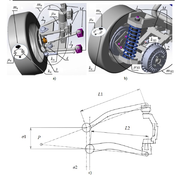 На рисунке 2а показана 3D-модель базового варианта двухрычажной передней подвески, совмещенная с элементами динамической схемы конструкции. Конструкция сборки включает в себя следующие основные детали: рычаг верхний 1, рычаг нижний 2, поворотный кулак 3, шаровой шарнир 4, амортизатор 5. Здесь mк, mп – массы; μк, μп – коэффициенты демпфирования; kк, kп – коэффициенты жесткости колеса и подвески соответственно; M – масса электромобиля за исключением указанных систем и деталей. Аналогичным образом динамическую схему и конструкцию задней подвески иллюстрирует рисунок 2b. На этом рисунке индексы «зп» для параметров массы, упругости и диссипации соответствуют задней подвеске.