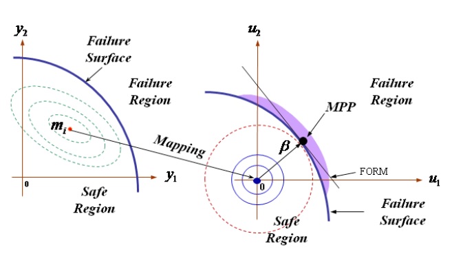 The optimum value of β corresponds to the Most Probable failure Point (MPP) which is represented by the minimum distance between the origin of the normalized space and limit state curve as shown in Fig. 1. The reliability index assessment is carried out using FORM (First Order Reliability Method).