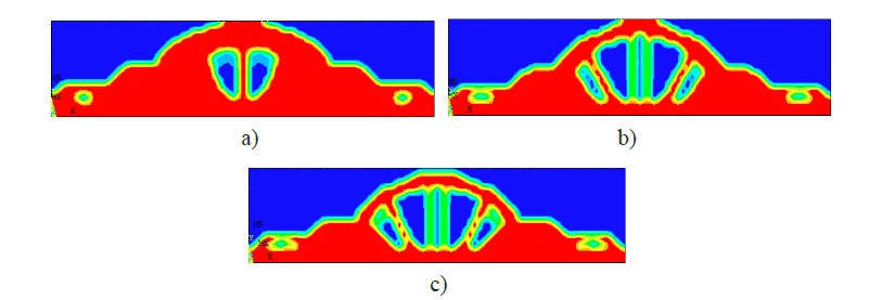 The starting configuration is considered to be the failure point where the optimization problem is to minimize the structural compliance subject to the volume constraint for the DTO (1) and also the reliability constraints for the RBTO (5). Figures 3a, 3b and 3c show the resulting 2D bridge topologies when considering the compliance as an objective function for DTO model (failure point ) and RBTO models when the reliability indices are: βt = 3, and βt = 3.8 using Objective-Based IOSF approach. The corresponding resulting compliances are shown in Table 1 for the initial configuration C0 and the optimal one C*. The used number of element for optimization is 1 360 nonlinear elements (PLANE82 with 8-nodes) and the Optimality Criteria (OC) method which implemented in ANSYS Software is used. The uncertainty is considered on the loading, the material properties and the volume reduction ratio (quantity of materials). The random variables are: E, v, F and Vf . The standard deviations are assumed to be proportional to the starting values ( ) presented in Table 1, i.e. ϭi = γimi (12), where γi = 0.1.