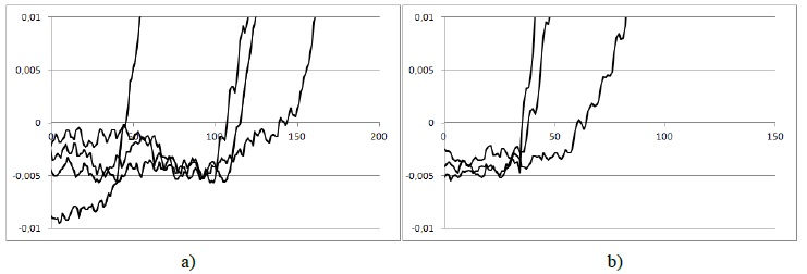 Детальное изучение полученных сигналов показало, что на регистрируемый мембранный потенциал накладывается гармоническая помеха с периодом 6 отсчетов. Учитывая, что один отсчет равен 1/300 с, получим частоту помехи, равную 50 Гц. Для ее исключения в регистрируемых данных использовался метод скользящего среднего окном в 48 отсчетов.