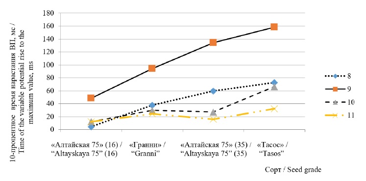 Fig. 9. Changes in VP rise time to the maximum value depending on a wheat variety at a given