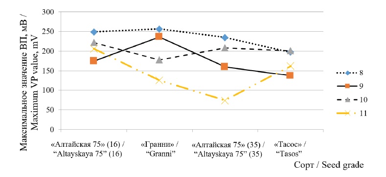 Fig. 11. Changes in the maximum VP value depending on the wheat variety