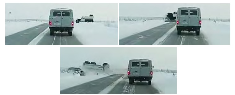 Следует отметить, что в транспортном потоке автомобильных дорог общего пользования доля рассматриваемой техники невелика и не превышает 0,01 %. В таких условиях составить репрезентативную выборку причин возникновения различных аварий не представляется возможным. Исходя из открытых источников информации, можно утверждать, что ДТП с указанной техникой имеют место быть (рис. 1 и 2), причем часть из них связана с недостаточной эффективностью торможения, в том числе и на обледенелой дороге, а часть – с потерей устойчивости при экстренном торможении [1; 2].