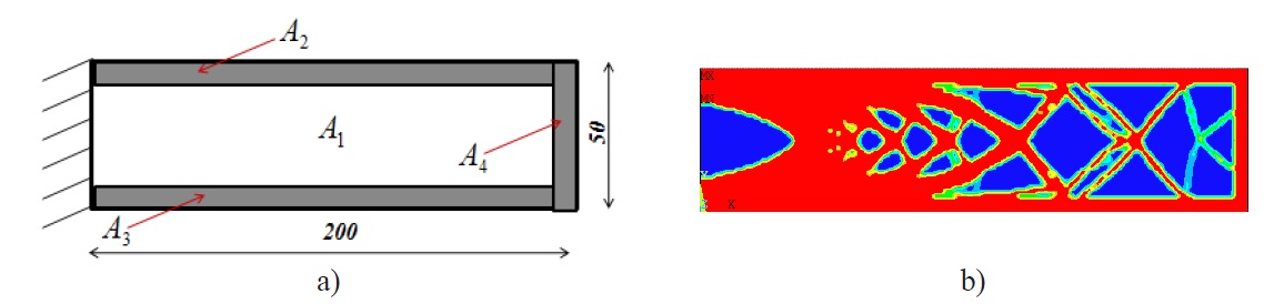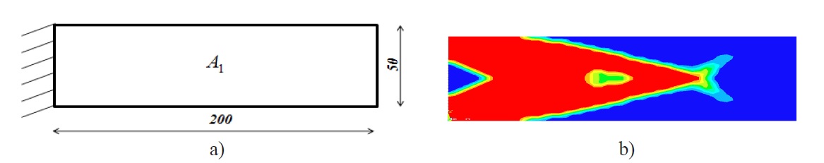 a) a cantilever beam with double non-optimized areas; b) resulting topology