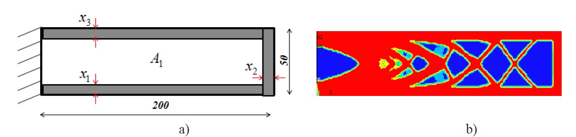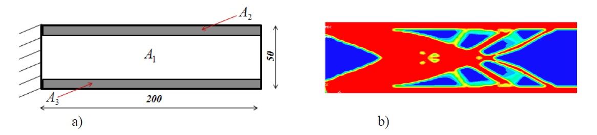 Fig. 2, a shows the geometric model of the studied beam, considering middle part as the optimization domain A1 and the upper and lower parts as the domain not to be optimized (A2 and A3). Fig. 2, b shows the corresponding resulting topology.