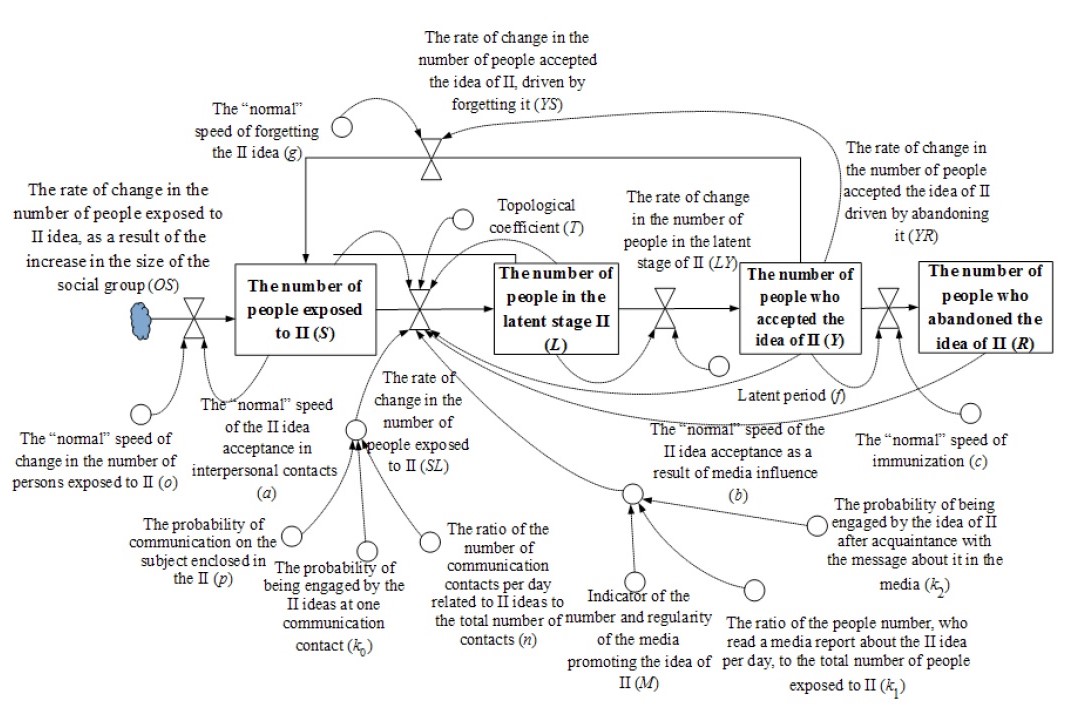 При этом системно-динамическая модель ИПД, являющаяся логическим развитием модели ИВ, учитывает характеристики забывания информации, существования латентного периода, изменения размера социальной группы, топологию взаимодействия в группе, замещения идеи ИВ идеей противоборствующей стороны.