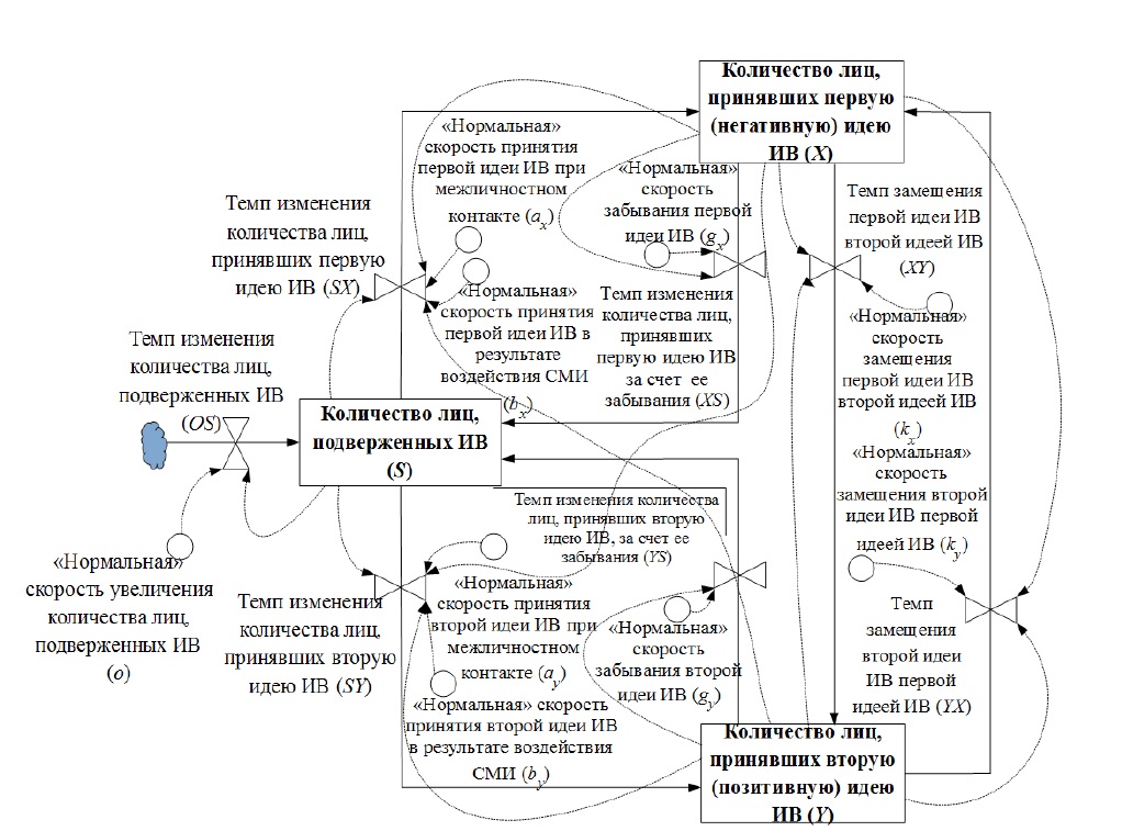 Построение системно-динамической модели ИПД связано с моделью ИВ на социальные группы. Предполагается, что в социуме одновременно идет распространение двух противоположных идей ИВ (положительной и отрицательной). Потоковая диаграмма, описывающая системно-динамическую модель ИПД, будучи представленной системой дифференциальных уравнений (4), приведена на рис. 2.