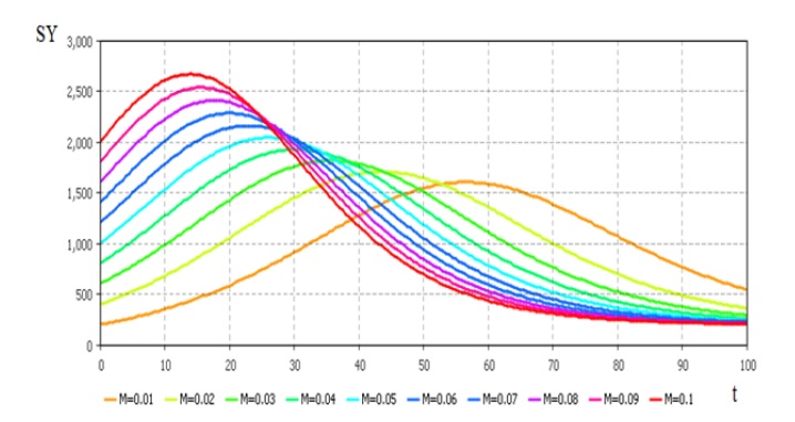 Результаты некоторых модельных экспериментов по изучению влияния различных параметров на динамику процессов ИВ приведены на рис. 3–5. Пример имитационного эксперимента с системно-динамической моделью ИПД приведен на рис. 6.