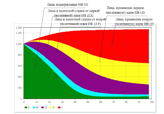 Для практической реализации системно-динамических моделей ИВ и ИПД использовались статистические данные о распространении различных информационных воздействий в социальных сетях, а также данные опросов в социальных группах. Отметим, что процесс имитационного моделирования, осуществленный с использованием современной программной платформы Anylogic, позволяет «проигрывать» любое количество противоборствующих идей11. Основными переменными, динамика которых в социуме отслеживалась с помощью разработанных моделей, является количество лиц: