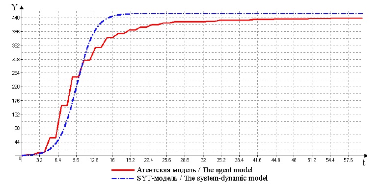 Отметим, что результаты моделирования на основе системно-динамического и агентного подходов совпали с достаточной степенью точности (рис. 7). Коэффициент согласования между моделями составил 94 %, со статистическими данными – 92 %.