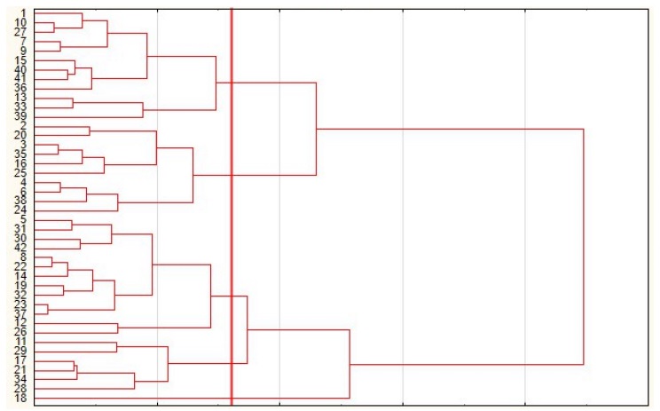С целью выделения однородных групп поселений для сравнения времени распространения ИВ в них, исходя из топологических характеристик, применен иерархический метод кластерного анализа – метод Вальда. Дендрограмма кластеризации представлена на рис. 9.