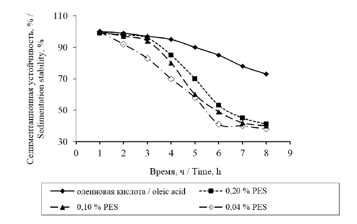 По полученным данным строили график в координатах «седиментационная устойчивость (%) – время (ч)». В качестве эталона сравнения использовали добавку олеиновой кислоты в количестве 0,08 массовой части.