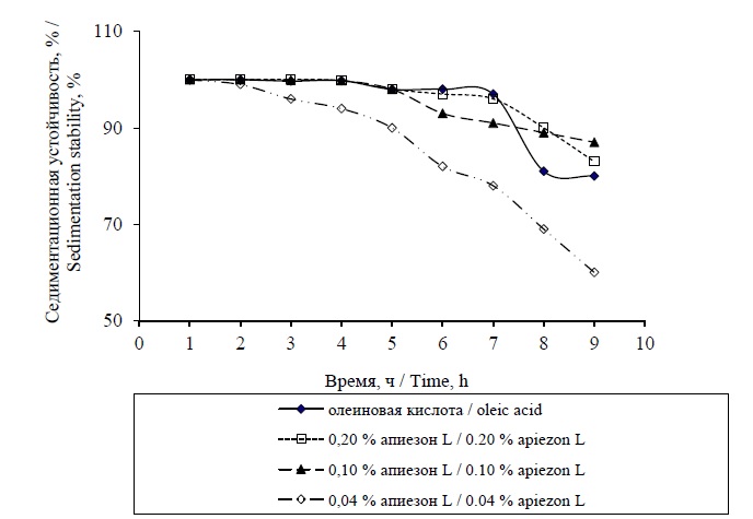 При использовании в качестве стабилизатора апиезона МН получен положительный результат. Седиментационная устойчивость суспензии оказалась на уровне эталона (олеиновой кислоты).