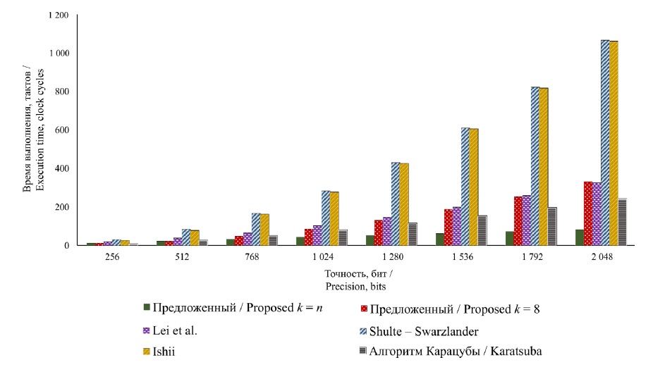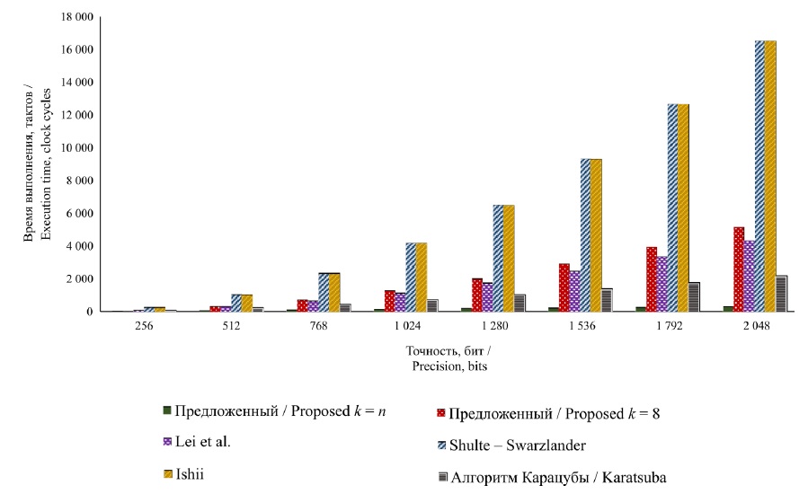 Задача повышения скорости вычислений при выполнении расчетов в сверхбольших числовых диапазонах частично решается за счет применения специализированных процессоров-ускорителей для поддержки вычислений с использованием длинной арифметики. Например, японские ученые [9] представили семейство процессоров на базе FPGA, реализующих длинную арифметику типа «double-double» и «quad-double». Скорость решения задачи вычисления интегралов Фейнмана [10] с использованием данных процессоров приблизительно в 80–200 раз выше, чем скорость расчета с применением программных реализаций таких вычислений. Американскими учеными [11] приведены результаты реализации на FPGA целочисленных вычислений на длинных (разрядность – 64 000 бит) операндах в сравнении с вычислениями с применением библиотеки GMP: расчеты ускорились минимум в 5 раз при операциях сложения/вычитания и в 9 раз – при операции умножения.