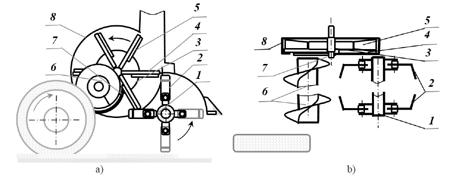 6 ‒ auger; 7 ‒ cylinder type cutterhead with throwing blades; 8 ‒ discharge pipe