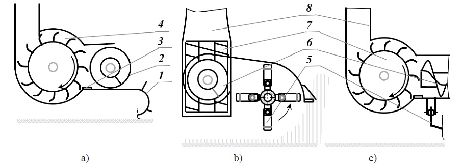 - Роторный кормоуборочный комбайн со швырялкой оснащен роторным измельчающим аппаратом с режущими ножами (рис. 1, b). Измельченные растения сначала выгружаются в шнек и затем шнеком подаются в швырялку.