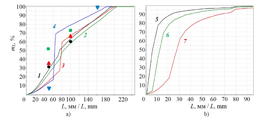 Расчеты показали, что распределение по длине массовой доли mL частиц растений, измельченных роторным аппаратом, имеет три участка, на которых функция распределения может быть аппроксимирована линейными зависимостями от аргумента L (рис. 6, а). На первом участке аргумент изменяется в диапазоне от нуля до величины, не превышающей подачи s на нож, на втором ‒ равен подаче s с незначительным варьированием нижней и верхней границы диапазона, на третьем ‒ в диапазоне от величины подачи до максимальной длины частиц. Испытания роторного кормоуборочного комбайна типа КИР-1,5 на кошении с измельчением люцерны высотой 440 мм15 показали, что, несмотря на значительный диапазон, экспериментальные значения массовой доли частиц длиной до 50 мм и свыше 100 мм практически точно соответствуют теоретически найденным значениям, показанным на графике 1 функции распределения (рис. 6, а). Максимальное согласование между экспериментальными и расчетными данными массовой доли частиц длиной свыше 100 мм наблюдается при кошении с измельчением вики с овсом16 высотой 780 мм (график 3) и эспарцета17 высотой 1 200 мм (график 4).