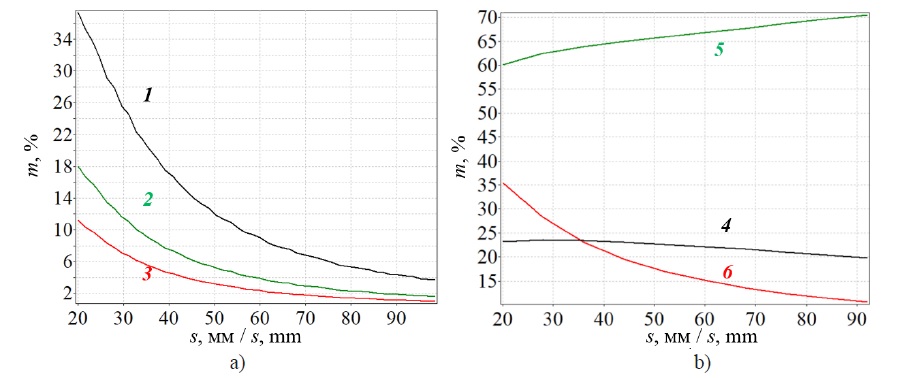 Двойной измельчающий аппарат повышает качество измельчения в том случае, если частота вращения шнека и/или дискового или цилиндрического аппарата обеспечивают среднюю расчетную длину резки, не превышающую величины подачи роторного аппарата (рис. 6, b). При этом массовая доля частиц, длина которых превышает 100 мм, снижается практически до нуля, а наибольшая доля частиц находится в диапазоне увеличенной и уменьшенной на 5 мм расчетной длины резки, изменяясь от 45 % при расчетной длине резки 25 мм до 75 % при расчетной длине резки 5 мм. Таким образом, невозможность регулирования угловой скорости шнека и/или дискового барабана не позволяет использовать двойной измельчающий аппарат на заготовке кормов с различными требованиями к качеству измельчения.