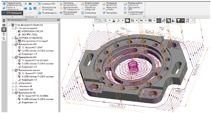 Способ получения конструкторских параметров детали на основе API программно реализован в составе коммерческой CAM-системы для платформы КОМПАС-3D. С общим описанием функциональных возможностей модулей CAM-системы и примерами их использования можно ознакомиться по ссылкам в Интернете8, а также в рекламных публикациях [18–21]. CAM-система интегрирована в рабочую среду КОМПАС-3D по принципу одного окна с использованием элементов пользовательского интерфейса CAD-системы (рис. 2). Ассоциативность траекторий обеспечивает автоматическую актуализацию управляющей программы для станка с ЧПУ при изменении размеров или положения опорных объектов обрабатываемой детали [22]. Интеграция на уровне интерфейса пользователя выполнена с помощью API КОМПАС-3D, на уровне геометрических расчетов посредством API математического ядра C3D [23].